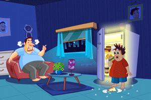 嘿嘿!老爸睡着了!冰箱里应该还有好多好吃的!一款敏捷小游戏——小胖偷吃。在午夜,小胖突然肚子饿的不行,怎么办?因为总是好吃懒做,所以他爸爸,对食物管的很严,想偷吃有点难度哦。你是不是有时也趁着夜深人静时,偷偷跑到厨房,打开冰箱,开始那快乐而又罪恶的行动呢?嘿嘿!快来体验下吧!不要让爸爸看见哦。