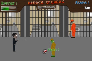 奥巴马劫狱小游戏介绍:奥巴马准备去关塔那摩监狱去拯救那些死囚,临行前,给美国公民写了封信,信誓旦旦的表示要拯救出所有的囚犯……可是,他到底能救出多少人呢,看看这位年轻总统的能耐吧!游戏有点恶搞的意思,通过扔出钥匙来释放被押解的人,总统能量有限,要抓紧时间呐!