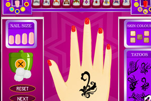 纹身美甲小游戏介绍:时尚的美甲小店中,有着各色的指甲油、戒指与帅气的纹身水印,快来打造一双不同反响的美手吧!