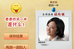 测测你另一半小游戏介绍:想知道你的另一半长得像谁吗?那就赶快来测一测吧!输入你的名字,选择你的性别,点击“测一测”按钮,马上就可以知道结果。