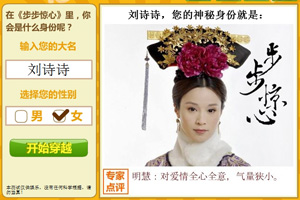 古装穿越剧《步步惊心》精彩无比,火遍了大江南北。看完后是不是希望自己也能穿越到古代经历一番?假如穿越到了《步步惊心》的剧情里,你会是什么身份呢?赶快来玩一玩就知道了。