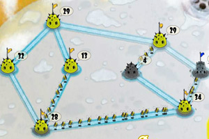 讲述虫界为了霸占地盘而展开大战。巢穴会产生虫子,你可以在自家的巢穴之间调度虫子,也可以攻击对方的巢穴,最后霸占所有巢穴。规则不太复杂,主要考验玩家的统筹能力与反应能力,同时实际上也是一个数字游戏,由易到难的数个关卡足够消磨你好些时间了。基地提高生命增长速度,达到无敌效果。